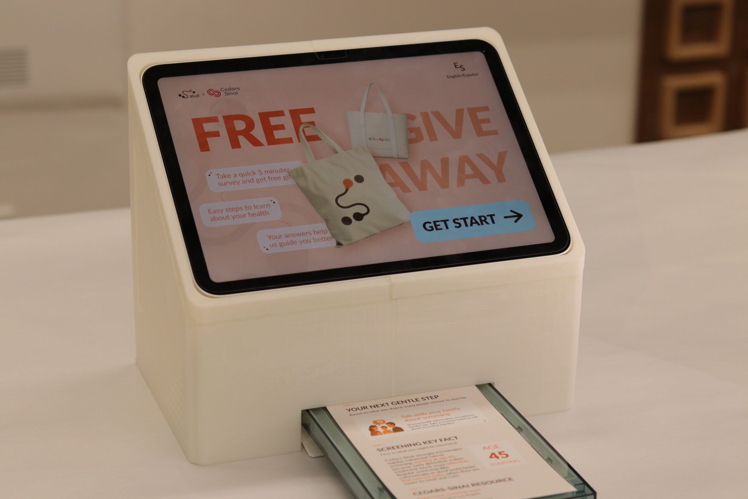 To reach community members at a familiar and trusted location, the Salud Station is installed at local Ralph’s Grocery stores. A greeter encourages shoppers to fill out a short questionnaire on a touchpoint screen. After answering a series of short questions about their knowledge of cancer and their health history, users receive a paper summary ticket. This physical reminder gives them a chance later to talk with a health navigator. Shoppers receive gifts for completing the survey such as tote bags, portable mirror and keychains.