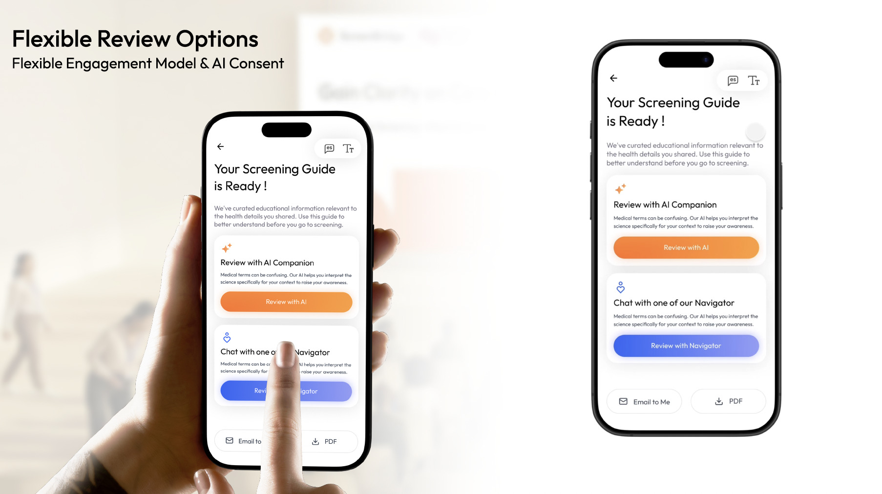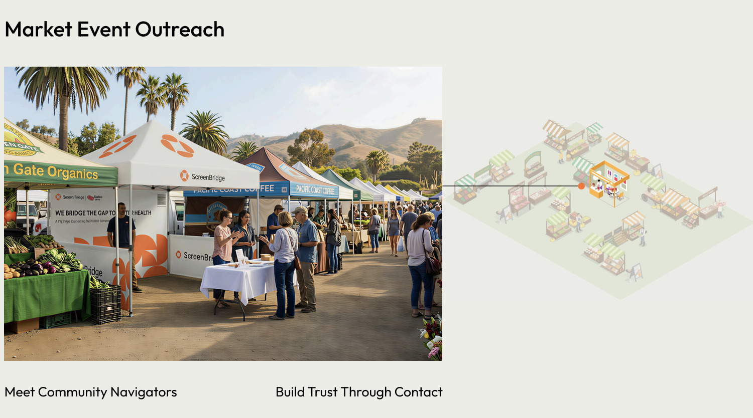 This three-pronged approach involves physical promotional posters, outreach at a local farmers market and a Screen Bridge app; each stage offers a new layer of cancer screening related information. At the onsite location, multiple small stalls feature cancer screening literature and colorful cards to collect; however only at the main outreach table can guests receive a special card. This table is also where navigators assist community members to download and access the Screen Bridge app. On-boarding with a live person helps users start the process with trust. Users take a short survey and create a screening guide that connects them with navigators. Before they leave the booth, guests receive tote bags, pins badges and quit smoking kits.