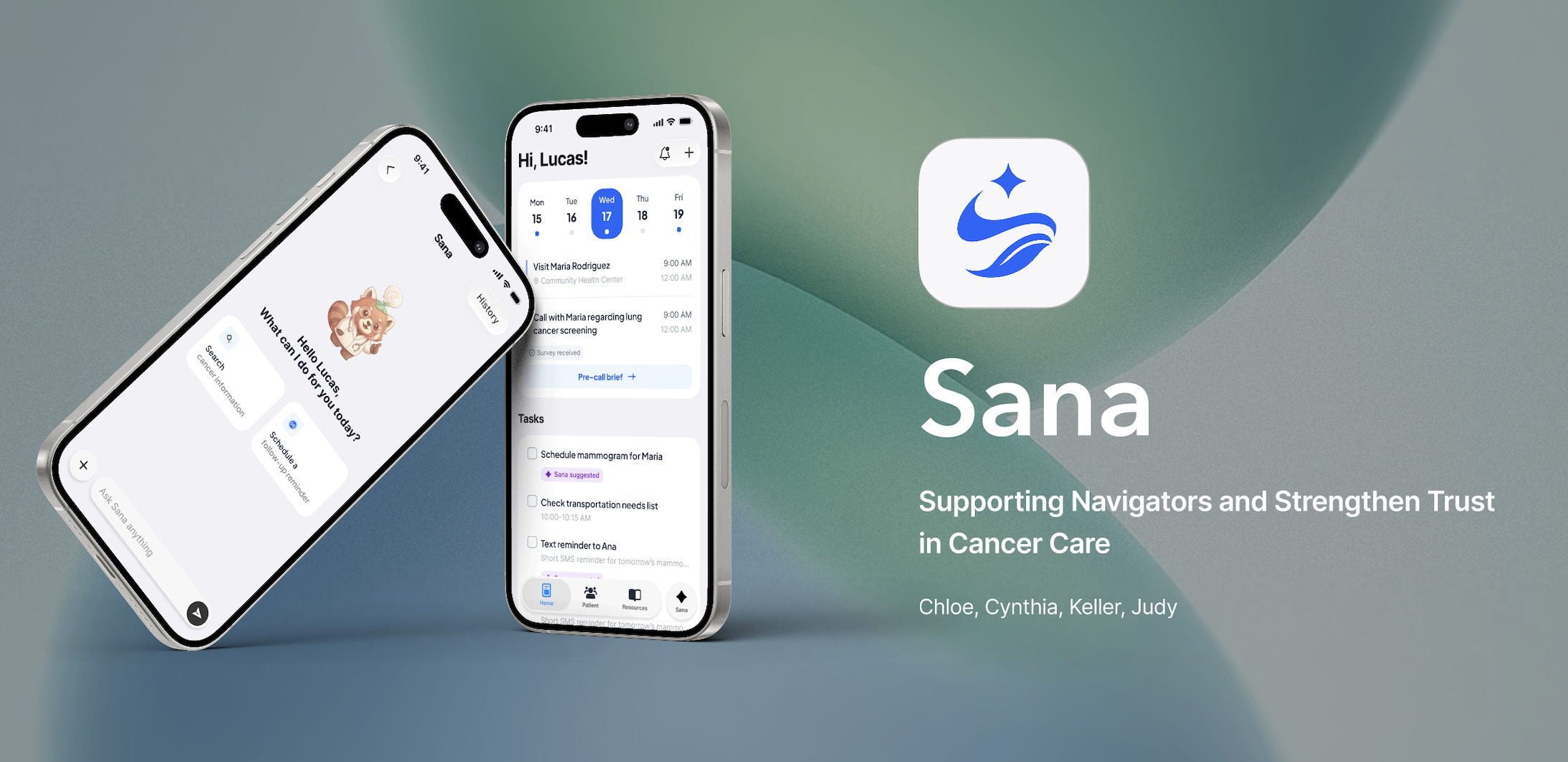 An app that supports the community navigator’s busy duties, Sana organizes important elements in one centralized system: a to-do schedule, client outreach history and up-to-date cancer information. The dashboard features a snapshot of the day’s appointments with follow-up suggestions. Designed as an invaluable assistance tool, Sana helps navigators manage patient care by collecting important patient/client information (that does not infringe on privacy) including notes on phone calls, language needs and upcoming screenings/follow-up needs. AI helps navigators with pre-call surveys, conversation guides and post-call ratings that informs future connections.