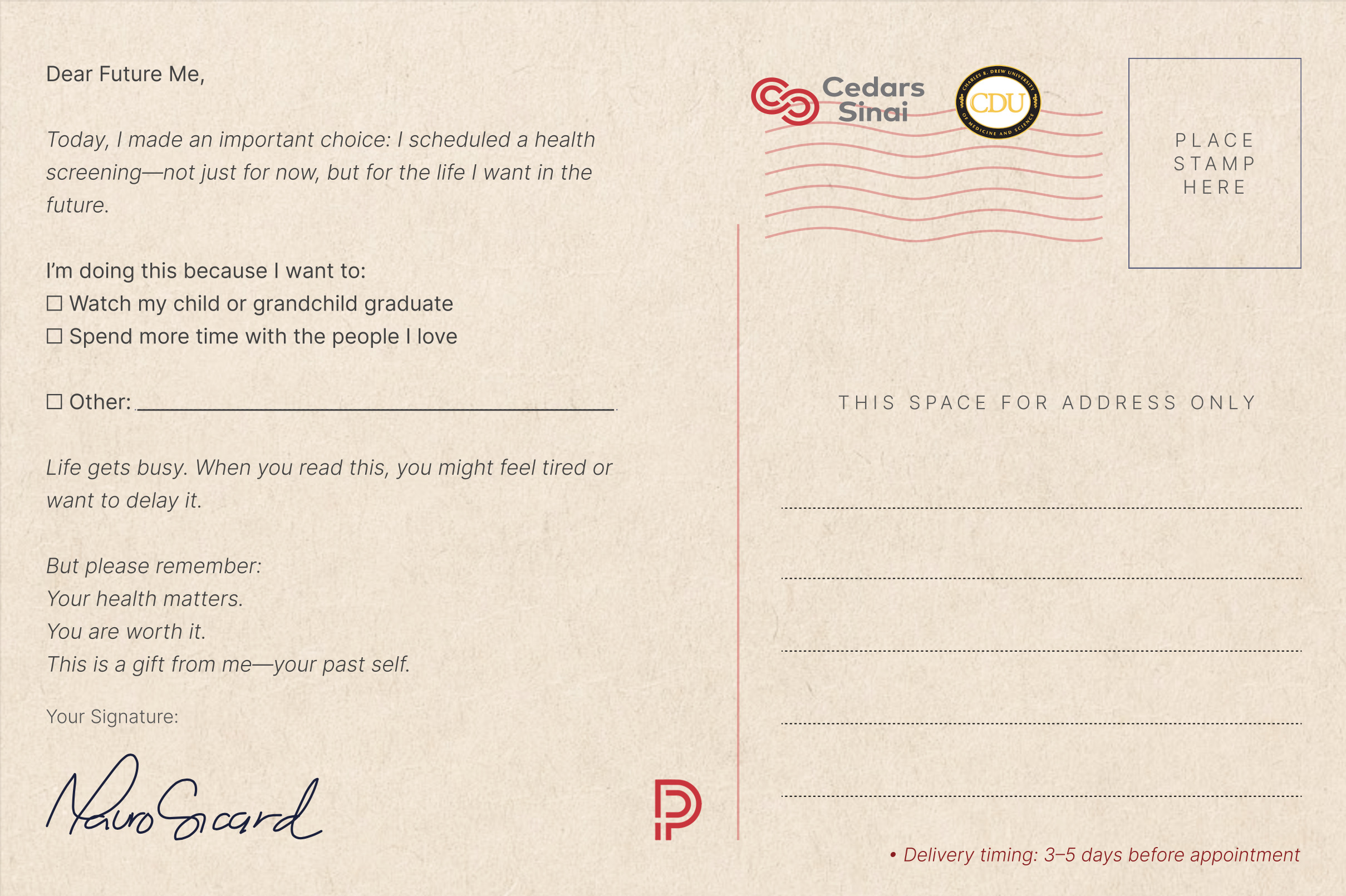 Combining prevention with equity, this project imagines a cancer screening drive and workshop taking place at Charles Drew University in Watts, a HBCU. A blueprint of action items combined with a user’s journey diagrams the steps involved in capturing attention, engaging participants and getting them in a screening room. Participants receive a goody bag if they take a simple risk assessment for top mortality cancers for Black populations: breast, prostate and pancreas. Once they get screened, participants write a post card to themselves as a reminder of the next upcoming screening. Also, as a reward for screening, participants receive a passport, a leathered-like textured booklet where they can keep private information about cancer screenings and follow-up appointments.